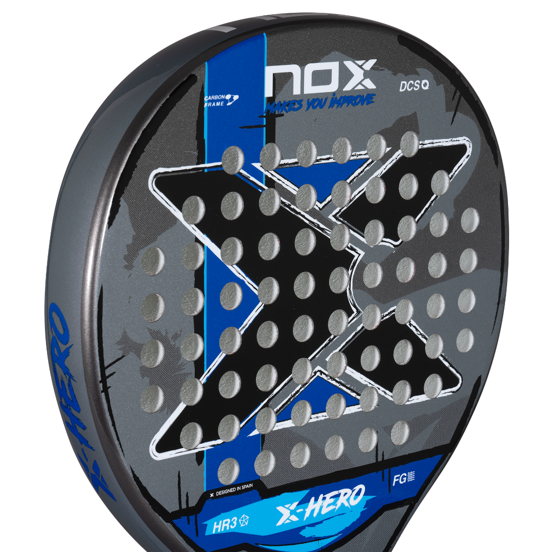 De NOX X-Hero Blue is speciaal ontworpen voor degenen die hun eerste stappen zetten in de padel of al enige ervaring hebben en hun spelniveau willen verbeteren. De constructie en technologieën bieden een uitstekende combinatie van controle, comfort en precisie, waardoor het een uitstekende keuze is voor zowel trainingen als de meer veeleisende wedstrijden. Dankzij het ronde formaat biedt het een grote wendbaarheid en een brede sweet-spot, wat zorgt voor een dynamischere en leukere ervaring op de baan.